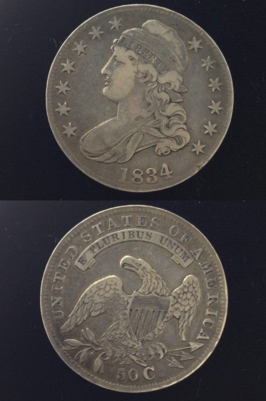 1834 O-105 VF. Nice old silver gray coin. The edge lettering is missing completely. I suspect that the edge was tapped or 'spooned' to eliminate the lettering. There is a hint of a wire rim all around. Hard to be sure.